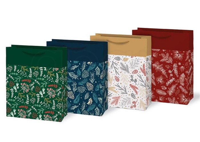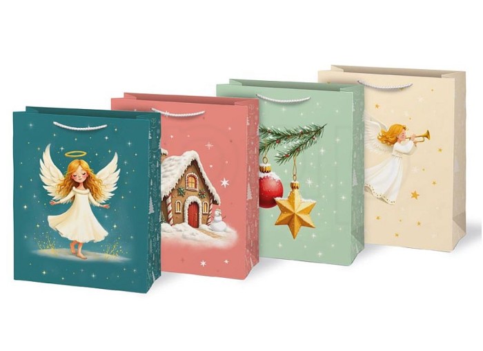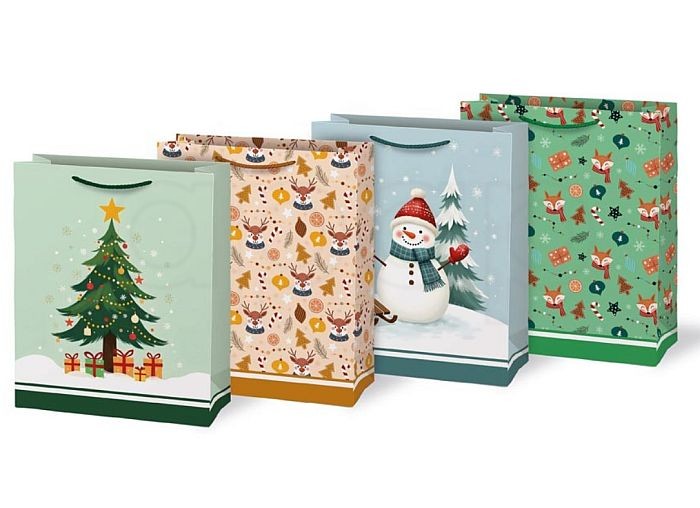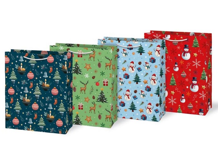 Papírová dárková taška, vánoční motiv, pevné ucho, štítek. Mix designů.