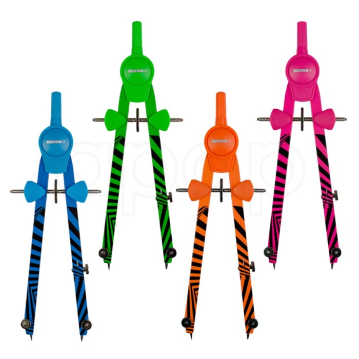 Vysoce kvalitní kovové kružítko v neonových designech. Kolečko pro fixaci vzdálenosti tuhy od středu. Neklouzavé upevnění jehly a tuhy. Univerzální adaptér v sadě. Obsahuje náhradní tuhy. V praktické plastové uzavíratelné krabičce.