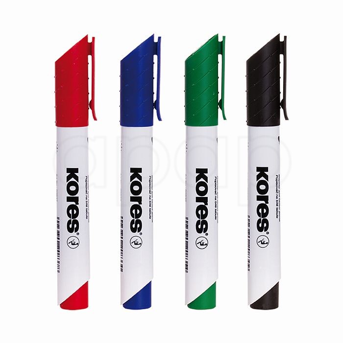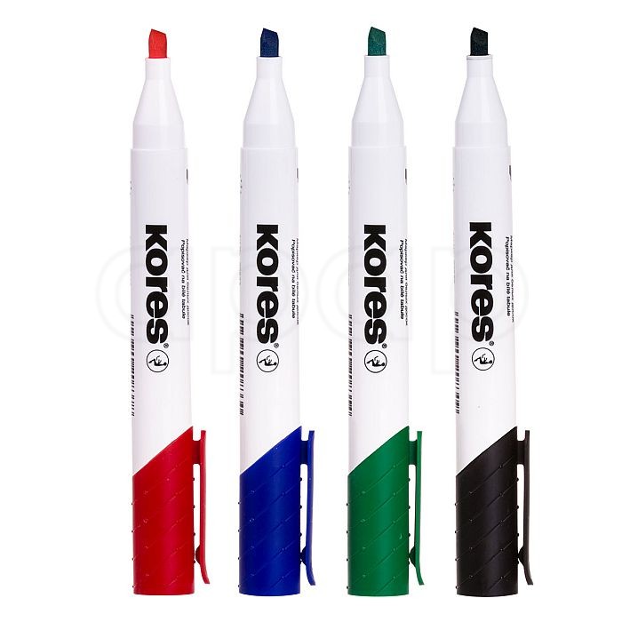 Sada popisovačů na bílé tabule ve čtyřech základních barvách. Za sucha stíratelné. Netoxické - neobsahuje xylen, toluen, benzen. Vydrží bez víčka min. 48 hodin. Šikmý hrot.