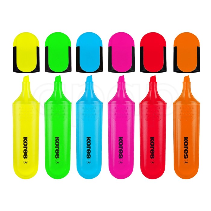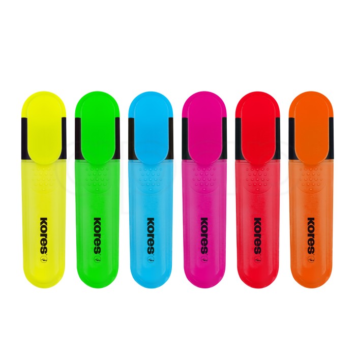 Souprava velkokapacitních zvýrazňovačů, klínový hrot. Vhodný pro psaní na všechny druhy papíru. Inkoust odolný proti UV záření. Pastelové odstíny - žlutá, růžová, oranžová, modrá, fialová, zelená.